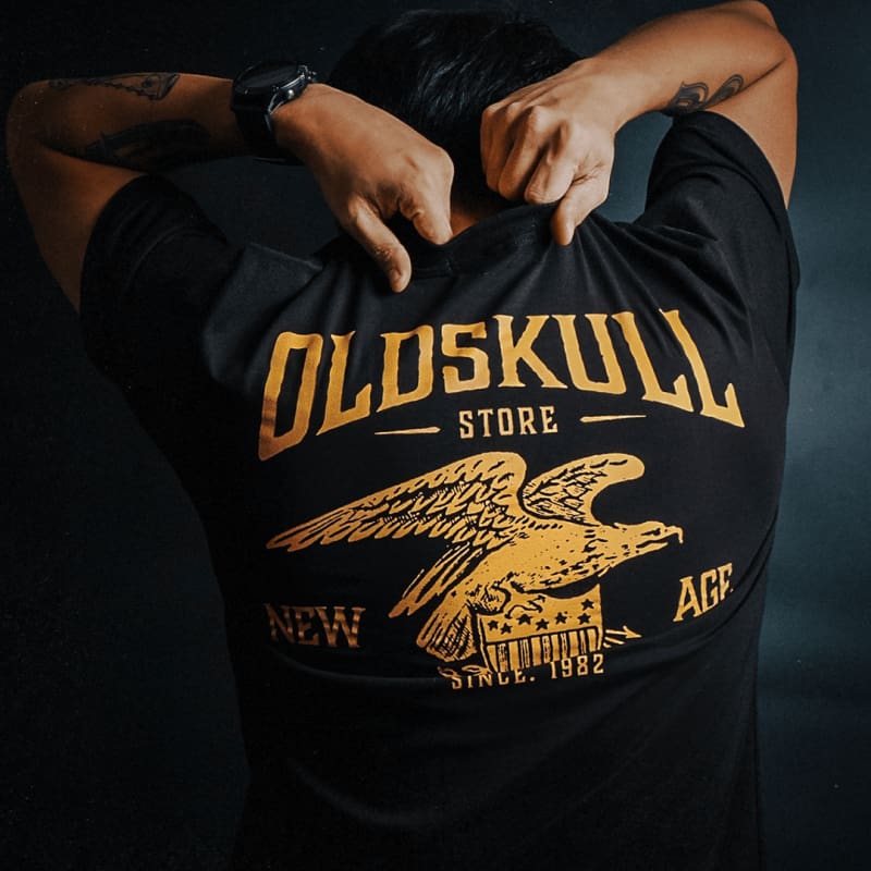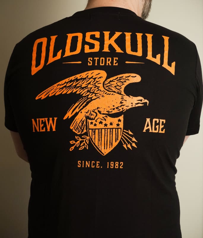 This shirt is similar to the Harley Davidson style of shirts.  It is black with orange print.  It has a small Oldskull Shirts logo on the front.  On the back it has an large eagle over a shield design with the words Oldskull Store written over it.  It is a vintage streetwear design.